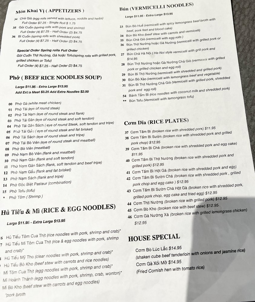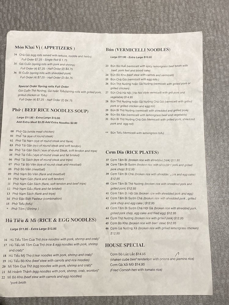 Introducing the menu at Pho Pasteur, located at 1342 E Belt Line Rd, Richardson, TX, is a culinary adventure that celebrates the rich flavors of Vietnamese cuisine blended with elements of Thai and Japanese dishes. The menu showcases an enticing array of appetizers, such as Cha Gio Eggrolls and Goi Cuon Springrolls, perfectly paired with fresh vegetables, which are a delightful way to start your meal.